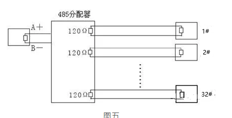對于這種情況,建議采用增加一個(gè)RS485分配器。該產(chǎn)品可以有效地將星形連接轉(zhuǎn)換為符合RS485工業(yè)標(biāo)準(zhǔn)所規(guī)定的連接方式,從而避免產(chǎn)生問題,提高通信可靠性。